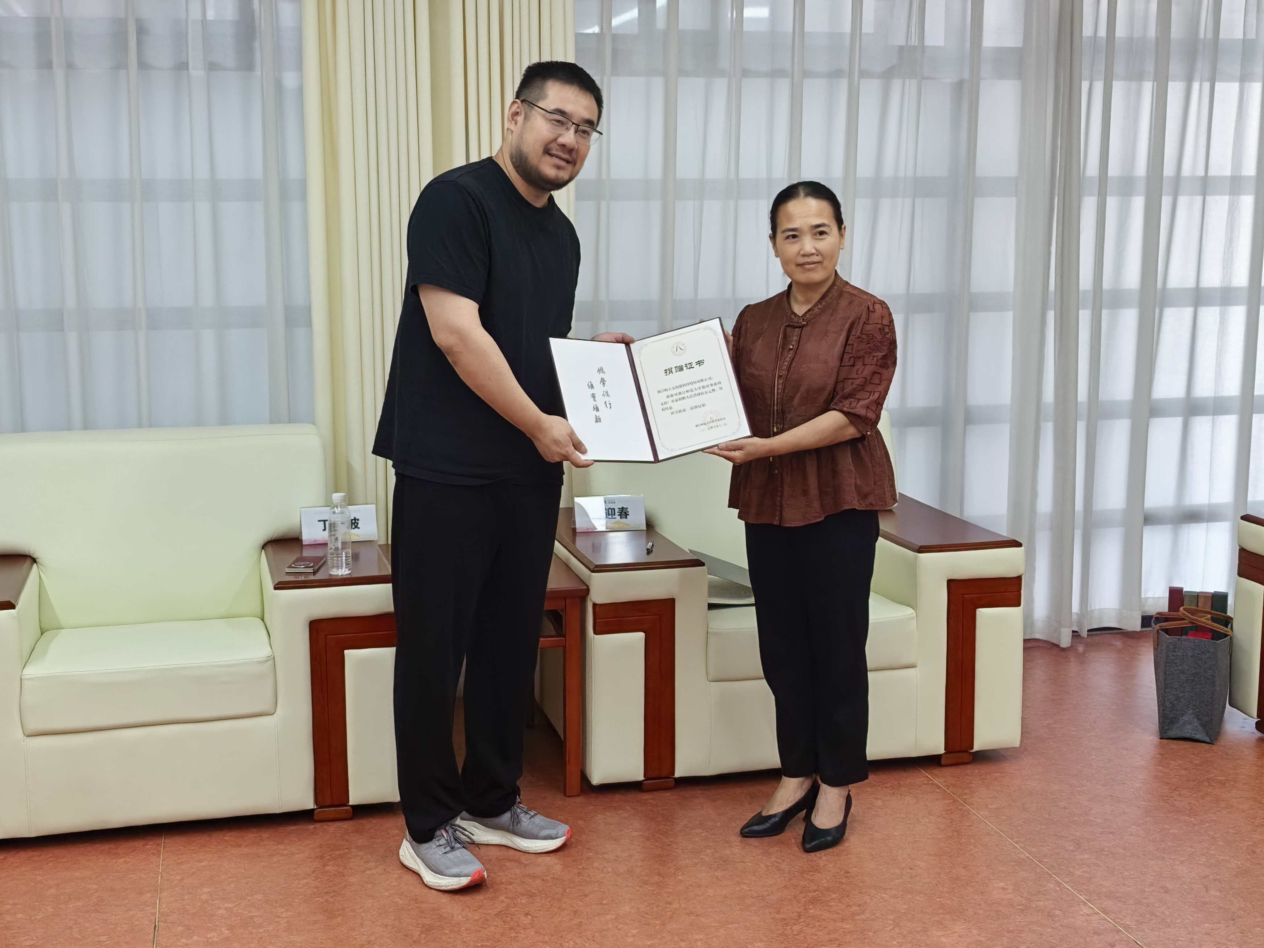 儀式后,浙師大黨委副書(shū)記呂迎春與校教育基金會(huì)秘書(shū)長(zhǎng)周紅霞會(huì)見(jiàn)了晴天科技總裁丁一波。呂迎春書(shū)記感謝晴天科技對(duì)國(guó)際教育的支持,并贊揚(yáng)企業(yè)在推動(dòng)“一帶一路”教育合作與科技交流中的遠(yuǎn)見(jiàn)。她希望未來(lái)校企進(jìn)一步拓展人才培養(yǎng),助力企業(yè)全球化發(fā)展。丁總則肯定了浙師大在開(kāi)放辦學(xué)及中非經(jīng)貿(mào)合作等領(lǐng)域的成果。